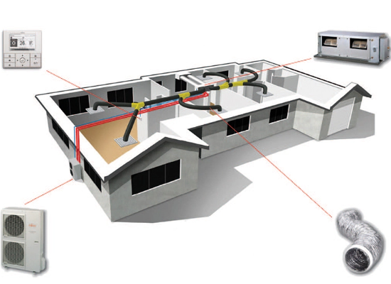| Ducted Systems | A ducted system will have a centralised unit that distributed cool air via cylindrical tubes to vents in the roof or wall of different rooms. | ![]() |