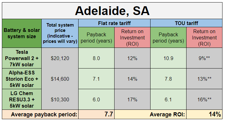 Note that feed-in rates for Adelaide systems were modelled at ‘0c/kWh’ for the Powerwall & Alpha ESS options due to restrictions expected to be imposed by SA Power Networks for systems with total inverter capacity over 5kW. |