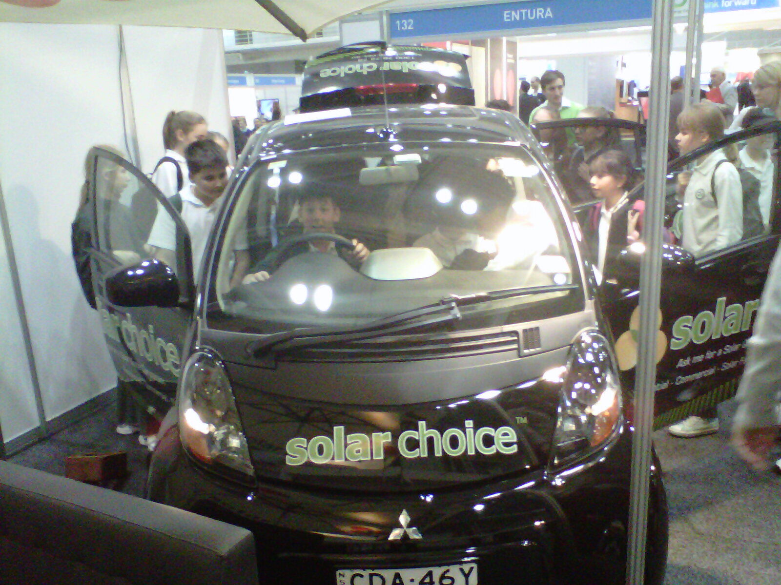 -Groups of schoolchildren enthusiastically taking in the sights, learning about clean technologies, and asking smart questions. Also sometimes getting into things exhibitors would prefer they not, including the Solar Choice EV. (GE’s own Mitsubishi i-MiEV, located directly behind the Solar Choice Commercial stall, remained locked, unaccompanied by its owners and therefore mainly untouched.)