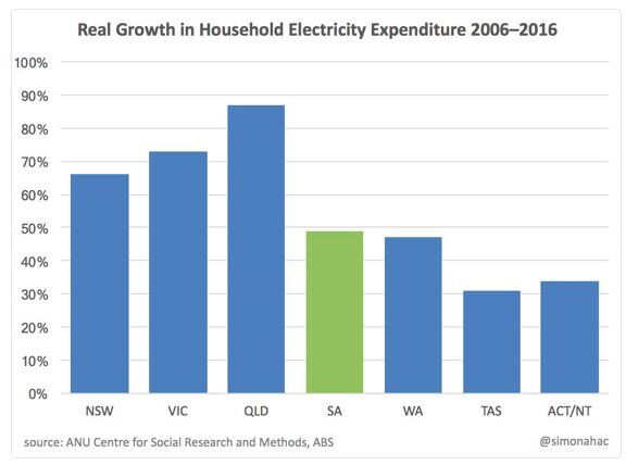 As this graph illustrates, South Australia’s price rises have been lower than those of the big three coal states – Victoria, Queensland and NSW