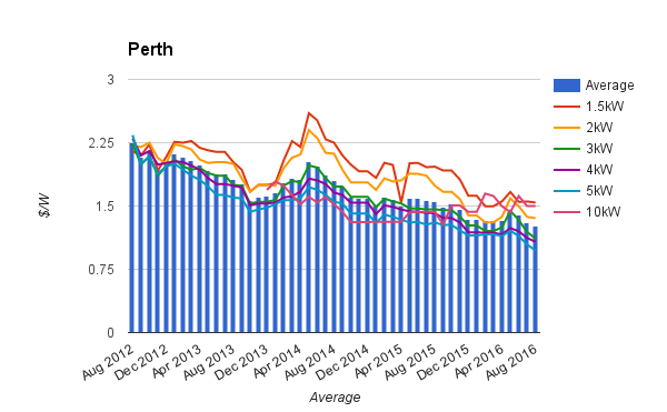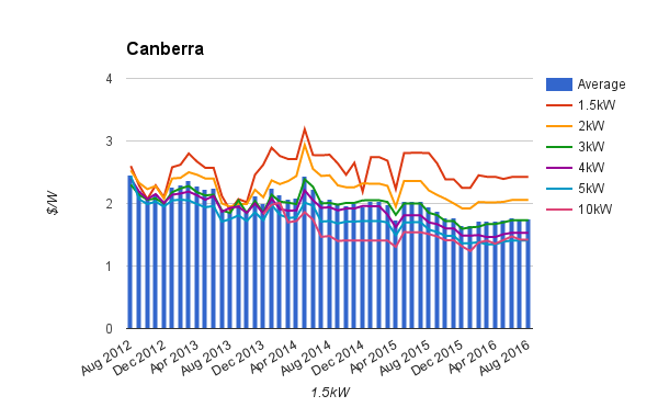 We note again here that our numbers are a sample of the market, and do not encompass the full range of prices. The August 2016 ‘lows’ for 3kW, 4kW and 5kW solar systems all hover around the $1/W mark, but we have certainly heard about systems of that size for less (although we would advise anyone consider a system that cheap to proceed with caution). Prices in this range would have been unheard of back in 2012 – or if they were seen, they would have been looked at with an extraordinarily high level of incredulity.