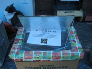 ‘No-tech’ Solar power oven, made out of cardboard, aluminium foil, and other household materials.