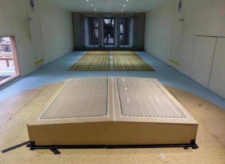 In order to understand the flow regime around the PoweRak product on a typical warehouse roof MEL Consultants was commissioned to use a 1:50 model in the wind tunnel and provide differential pressure data. Figure 22 shows one of the designs in the boundary-layer wind tunnel.