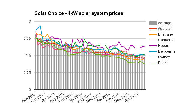 Average residential solar system prices dipped down to $1.63/W this month – on par with the low seen in April this year and close to the all-time low of $1.59/W seen in December of 2015. The price drop occurred across all system sizes. Interestingly, system price ‘highs’ have not come down much, low-end prices of around $1/W are becoming an increasingly common sight. Prices in Perth remain the lowest in the nation, although it is unclear whether these prices are indicative of the broader Perth market or a proclivity of the sample data available to Solar Choice through our installer network.