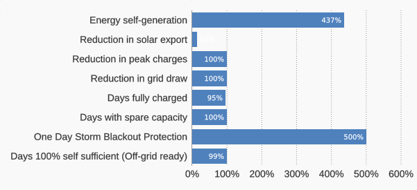 30kWh of usable battery storage capacity: ~3 days of energy independence (‘storm blackout protection’ in the graph below)