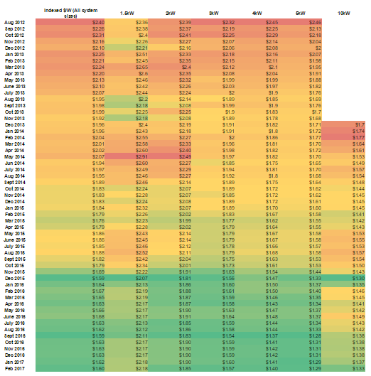 Colour-coded historic average solar system prices ($/W). (Dark red for highest, dark green for lowest, yellow for middle.)