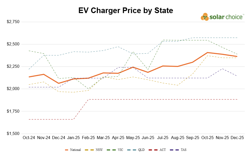 Solar Choice has a pre-vetted network of over 40 electric vehicle charger installers who have uploaded their price, product and warranty information into our database for our quote comparison service. To provide an indicative guide on pricing, Solar Choice has been publishing Australia’s EV Charger Price Index since 2024.